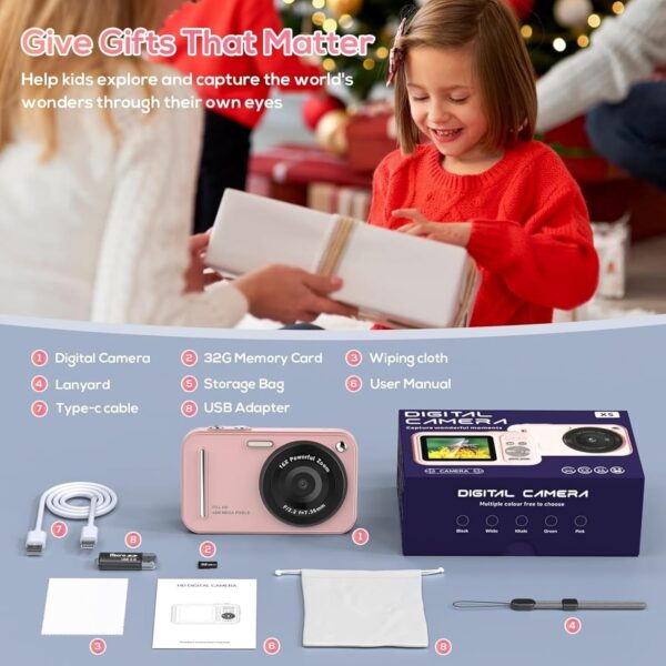 【Perfect Gift for Kids Who Love Photography】- Looking for a unique birthday or Christmas gift? This cameras for photography bundle includes a 32GB SD card, a USB Adapter, a Type-C cable, and a stylish carry bag—everything needed to start shooting right away. Designed for boys and girls ages 5+, it’s a fantastic way to nurture their passion for capturing life’s joys